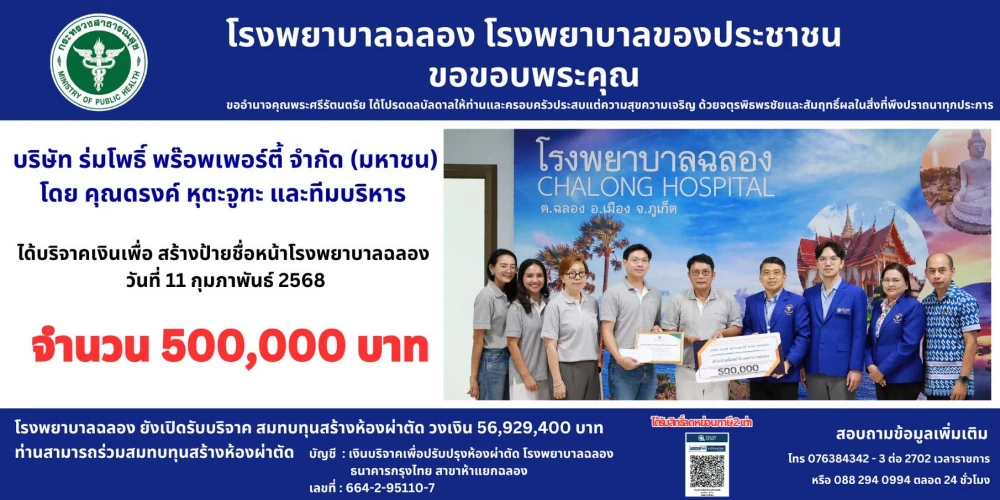 On 14 March 2025, Rhombho Property (The Title), a developer of Leisure Residence properties for sustainable living and investment, donated THB 500,000 to Chalong Hospital to support facility improvements.